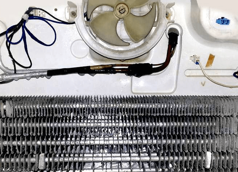 Говорит о засоре дренажной системы, неисправности ТЭНа оттайки или сбое таймера. Прочищаем дренажные трубки, восстанавливаем цепь нагревателя и перепрошиваем управляющий модуль.